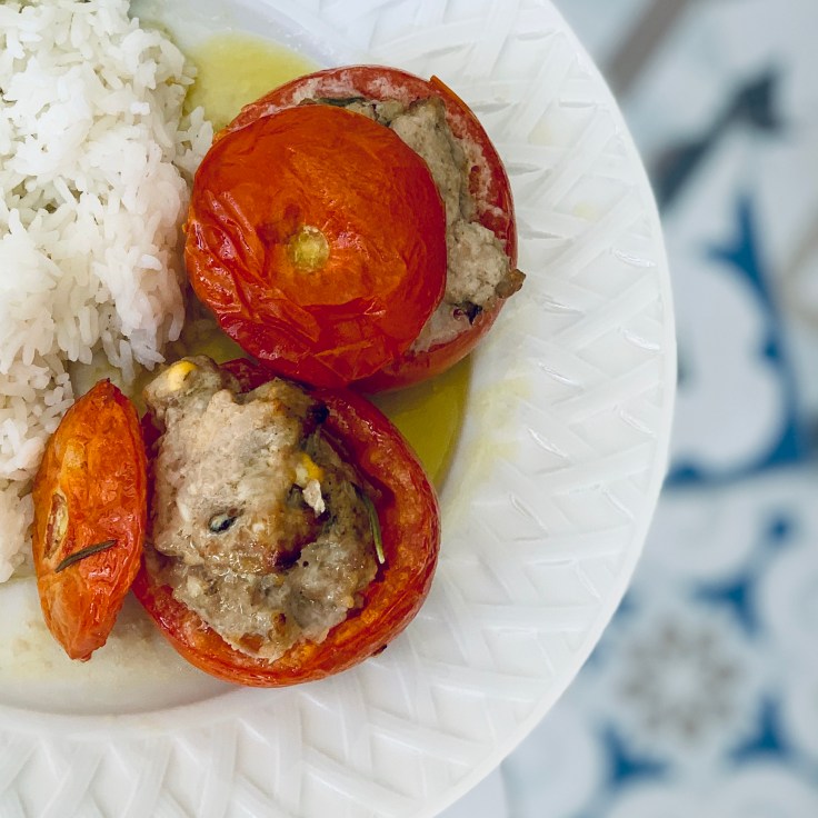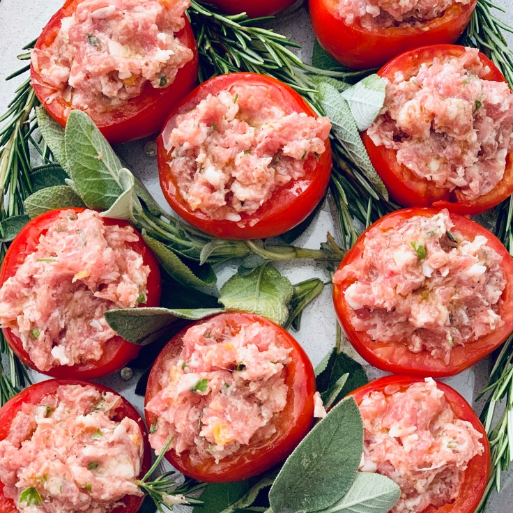 - Dans un grand plat, disposer les tomates (vidées de leur eau), mettre de la farce dans chacune d’entre elles et finir par leur chapeau