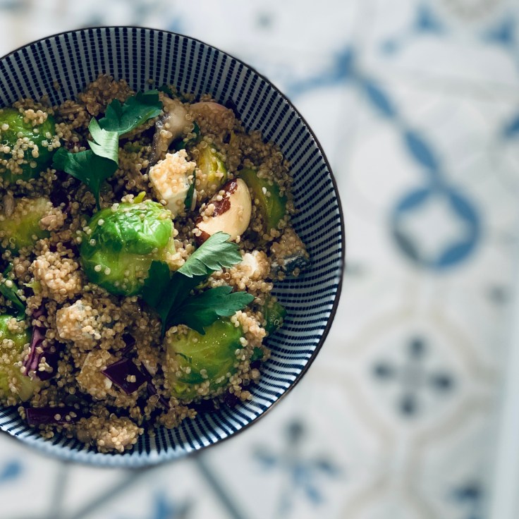 Dans cette salade, on retrouve des choux de Bruxelles, des champignons, du chou rouge, du fromage de chèvre affiné (chèvre-quinoa, ça fonctionne très bien) et bien sûr des graines et des herbes.