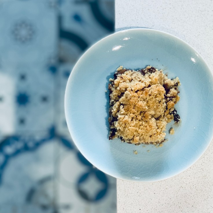 - Préparer l’appareil à crumble : mélanger la farine, le beurre, le sucre et la poudre d’amande jusqu’à l’obtention d’une pâte sableuse (certes un peu cassante ;-))