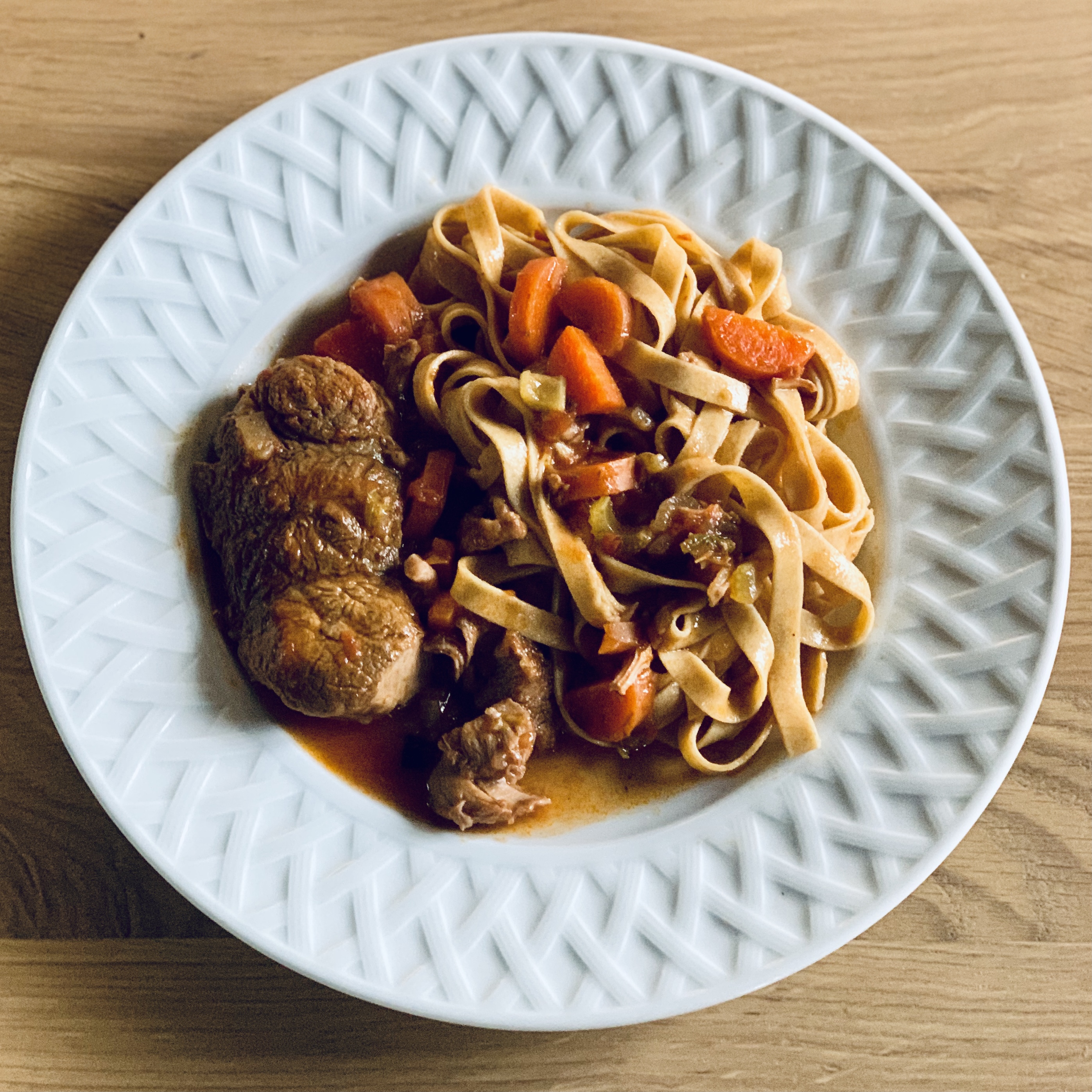 Je sers ce plat de tagliolini maison (quand j’ai le temps bien sûr !). Je sais que c’est très français de manger des pâtes avec un plat de viande, mais c’est comme ça, je suis française après tout (enfin à moitié).
