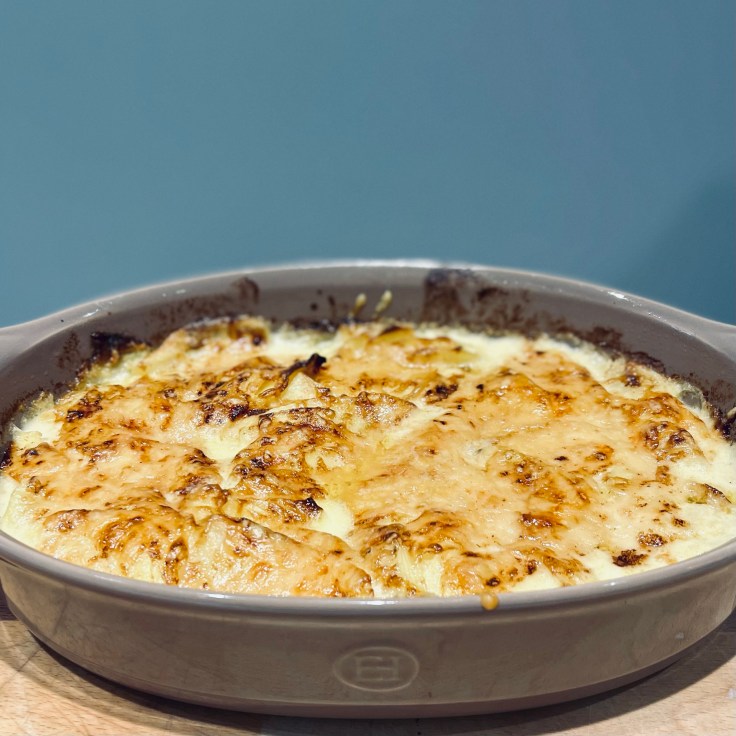 Après ma version associant la pomme de terre et le céleri (c’est ici pour la recette), voici la recette traditionnelle du gratin dauphinois (enfin presque car j’ajoute du fromage râpé, proscrit dans la version originelle).