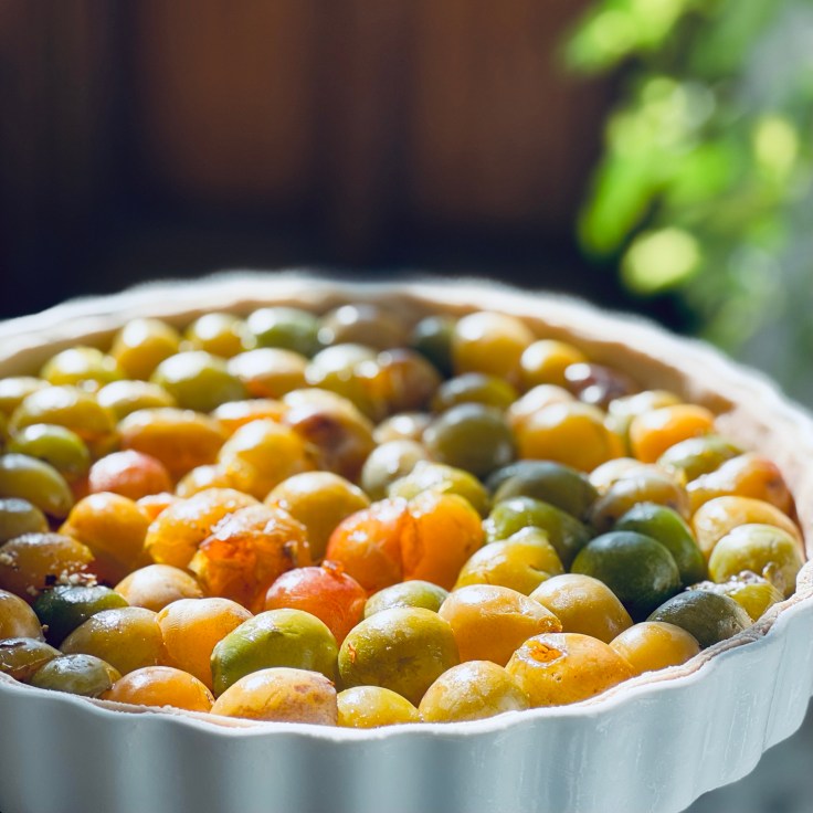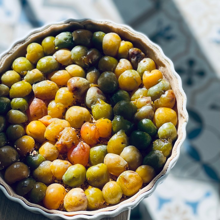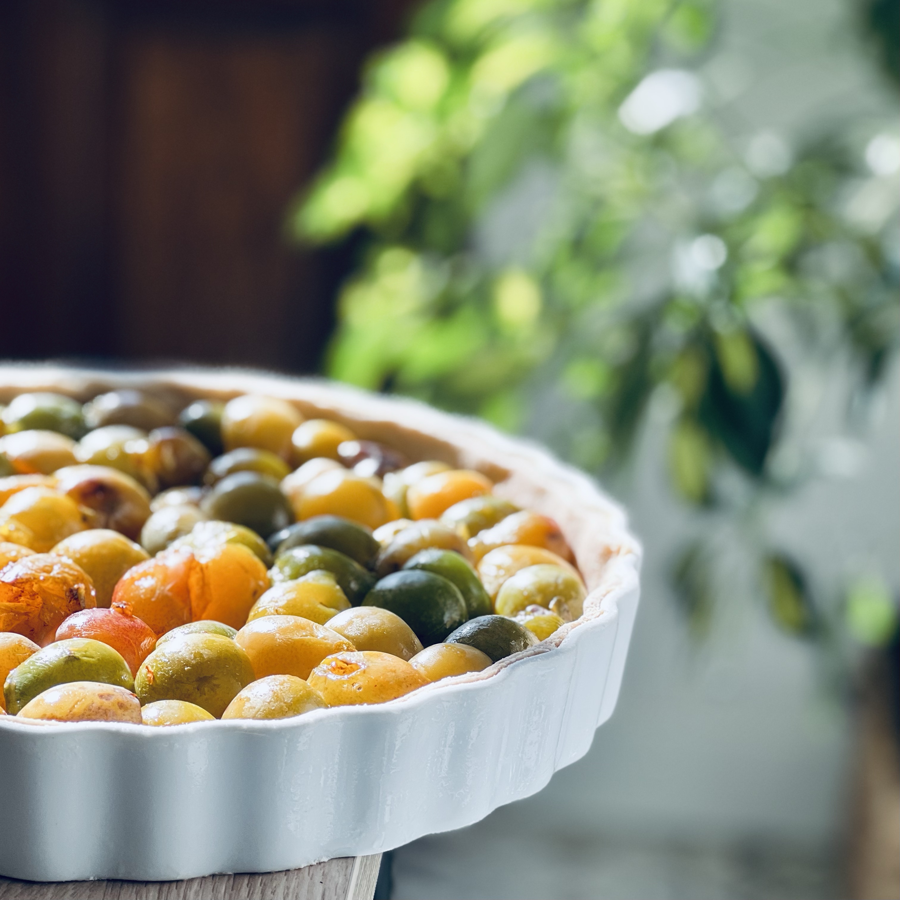 Les belles prunes Reine Claude du voisin, un délice :-). Il fait chaud cet été, aussi elles sont bien mûres. Hop la solution, une belle tarte aux Reine Claude. Pour absorber le jus des fruits, je soupoudre mon fond de tarte de poudre de noisette (du 41 of course !) et je laisse poser la tarte avant de la déguster.
