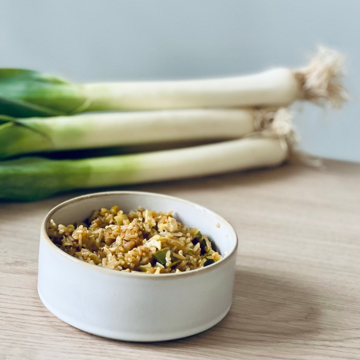 - 3 poireaux (la recette indique 1 poireau, j’augmente la quantité car je préfère le côté végétal au riz)