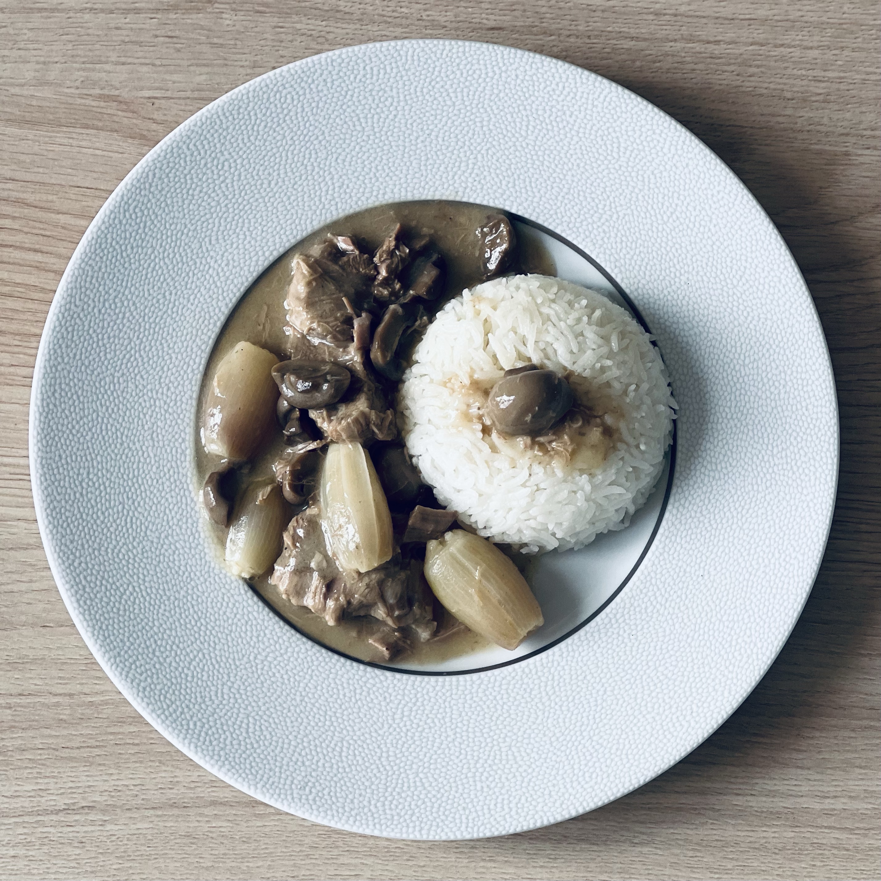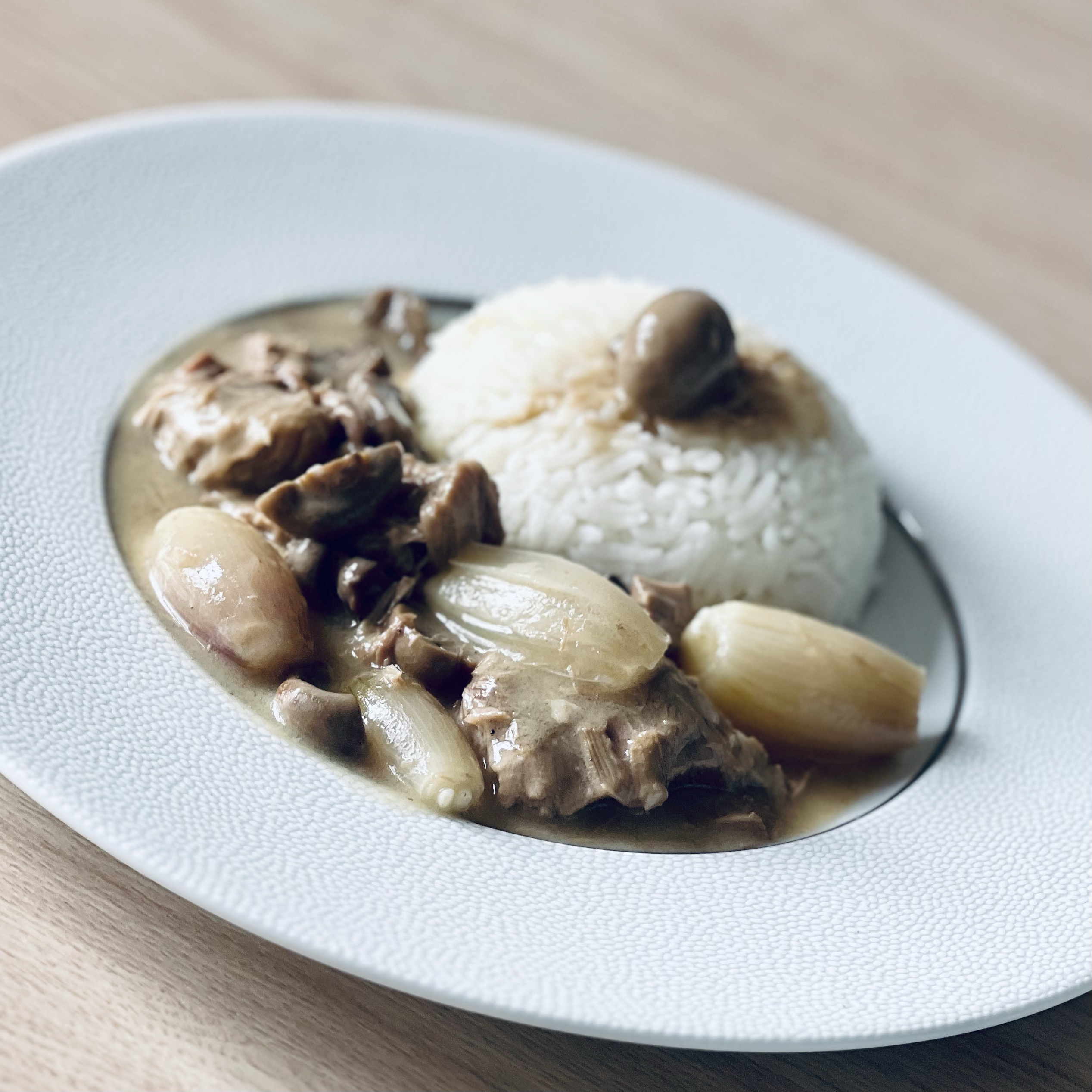 1 kg de viande de veau (dire au boucher que c’est pour une blanquette, il fera un mix de qualité )