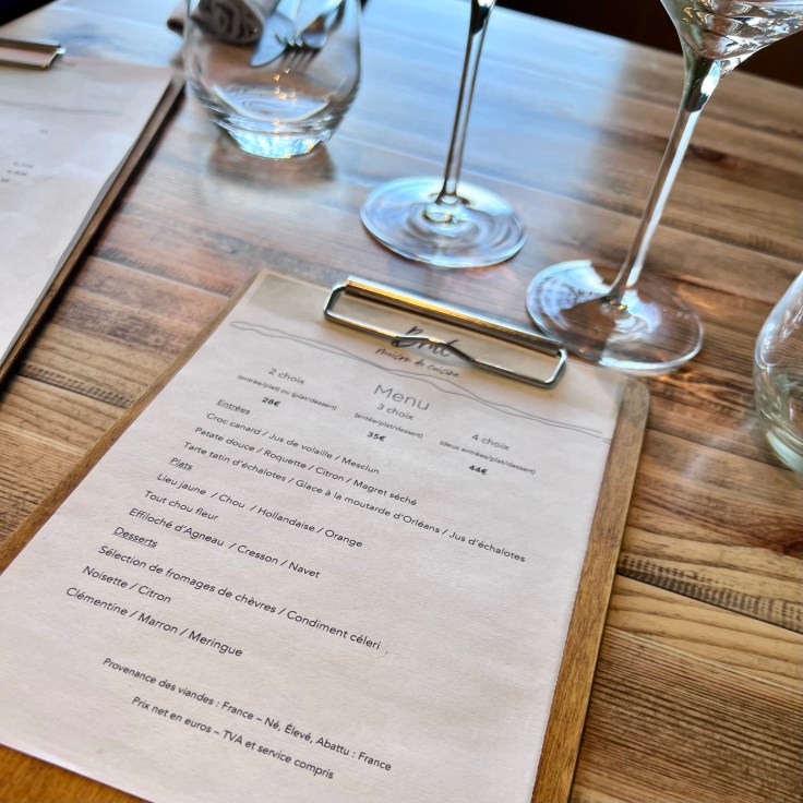 Revenons à notre sujet : le restaurant bistronomique « Brut Maison de cuisine » ouvert en automne 2021. C’est un peu notre cantine du vendredi midi :-). Le Chef met à l’honneur les producteurs locaux, les produits de saison à travers une carte simple et efficace. 3 entrées, 3 plats (dont un végétarien), 1 fromage et 2 desserts, hop et le tour est joué. Personnellement, une carte courte est bien plus rassurante, voire même un gage de confiance et de qualité.