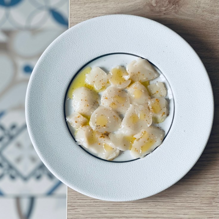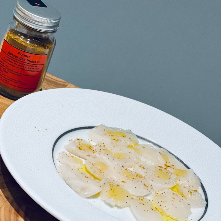 De belles noix de Saint-Jacques émincées en carpaccio (épaisseur en fonction de votre goût), de l’huile d’olive, la poudre retour des Indes de Roellinger, sel et poivre et hop le tour est joué !