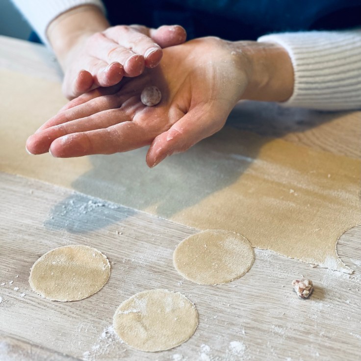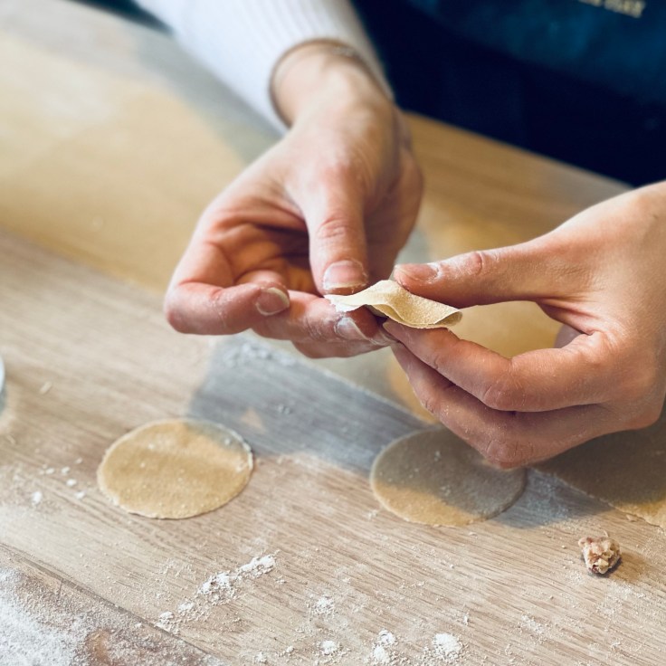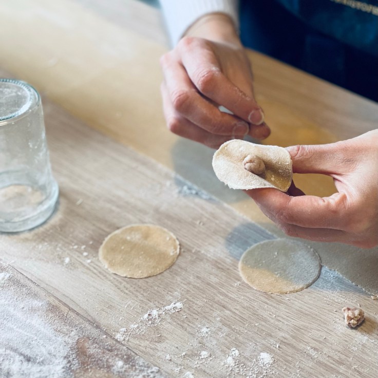 - Poser chaque cappelletto sur un plan fariné de farine de riz (cela évite qu’ils ne collent entre eux durant la cuisson)