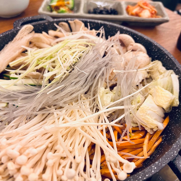 - Fondue veggie Boulgogi : champignons, tofu, légumes et vermicelles cuits dans un bouillon de sauce Boulgogi. Ce bouillon >> une tuerie !