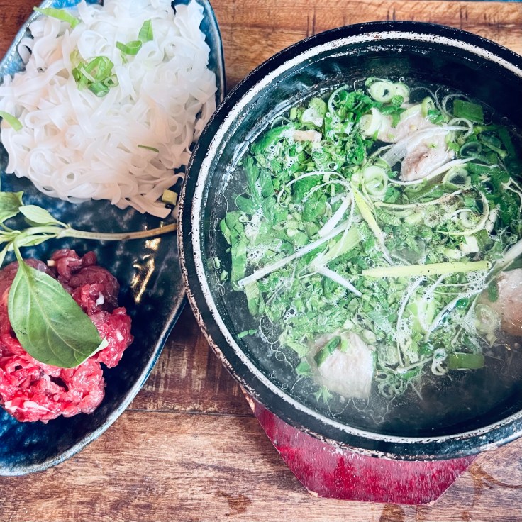 - Special Phở Du Chef : bouillon d’os de bœuf cuit à feu doux pendant 24 heures bœuf sauté – mi cuit – avec oignon, coriandre, oignon vert, coriandre longue, germes de soja