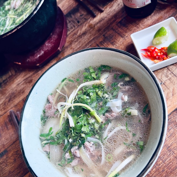 - La soupe Phở. Il s’agit d’une recette traditionnelle de cuisine vietnamienne, à base de bouillon de viande et de nouilles de riz, agrémentés de divers ingrédients. Elle a une place de choix avec pas moins de 8 variantes (dont 2 végétariens). C’était délicieux !