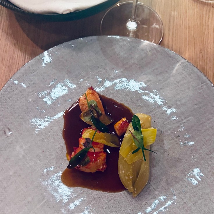 - Endive de Touraine infusée au safran, homard bleu juste saisi et jus de têtes au whisky. Accord ou désaccord de l’endive et du homard ? Et bien cela fonctionne incroyablement bien, l’endive était douce comme confite et le homard délicieux.