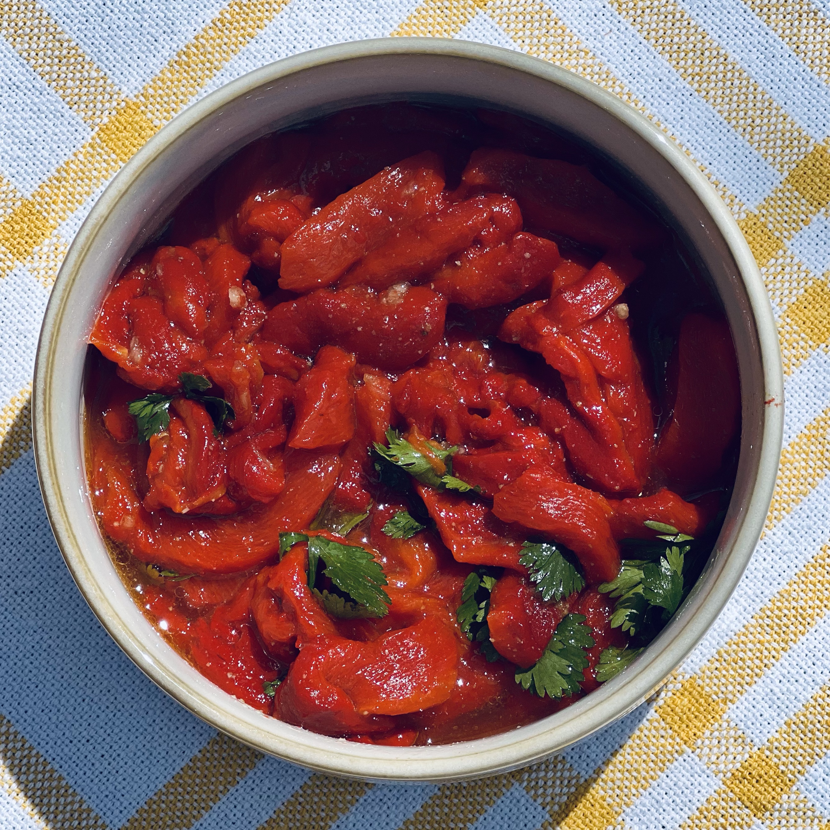 - Dans un saladier, mettre les poivrons, l’huile d’olive, l’ail haché finement, le cumin, les feuilles de coriandre, le sel et le poivre