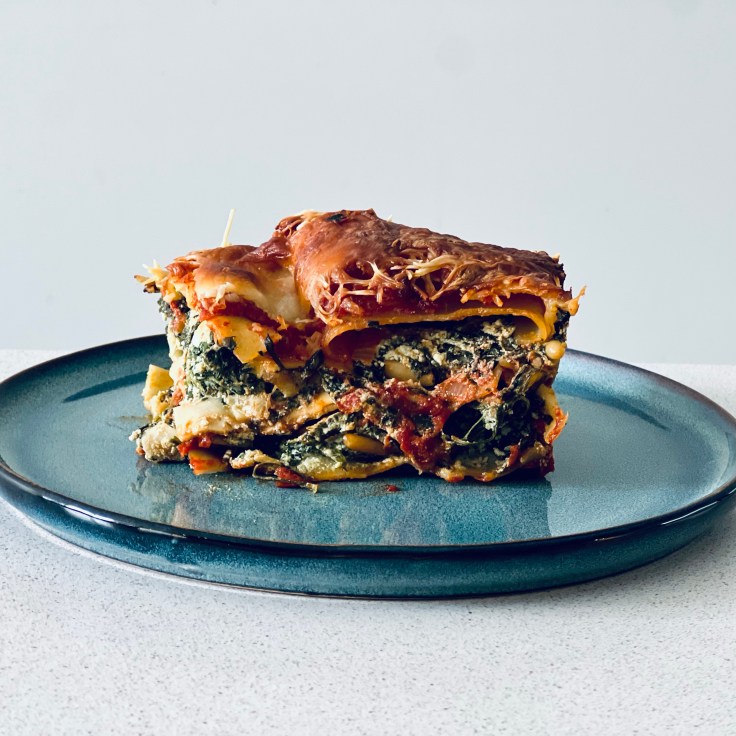 Une recette automnale qui met en valeur les épinards et la ricotta, ce dernier adoucissant les épinards. J’y ajoute ma sauce tomate maison en fond de plat et sur le dessus pour apporter de la douceur acidulée (le juste équilibre).