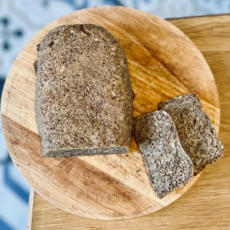 Ce pain est 100% végétal et sans gluten. J’adore sa texture ! C’est parfait avec un houmous, un écrasé d’avocat par exemple. Il accompagne parfaitement une soupe aussi.