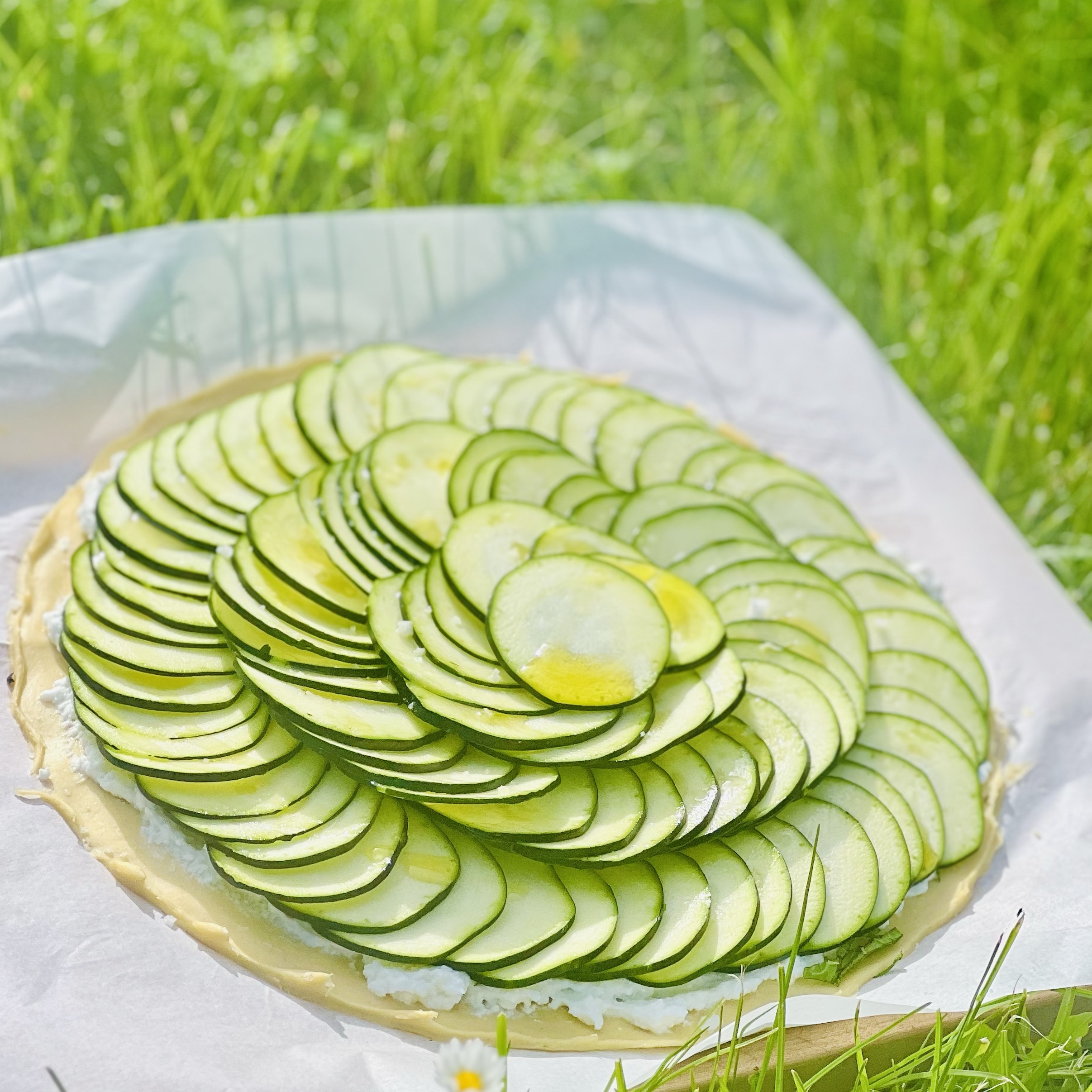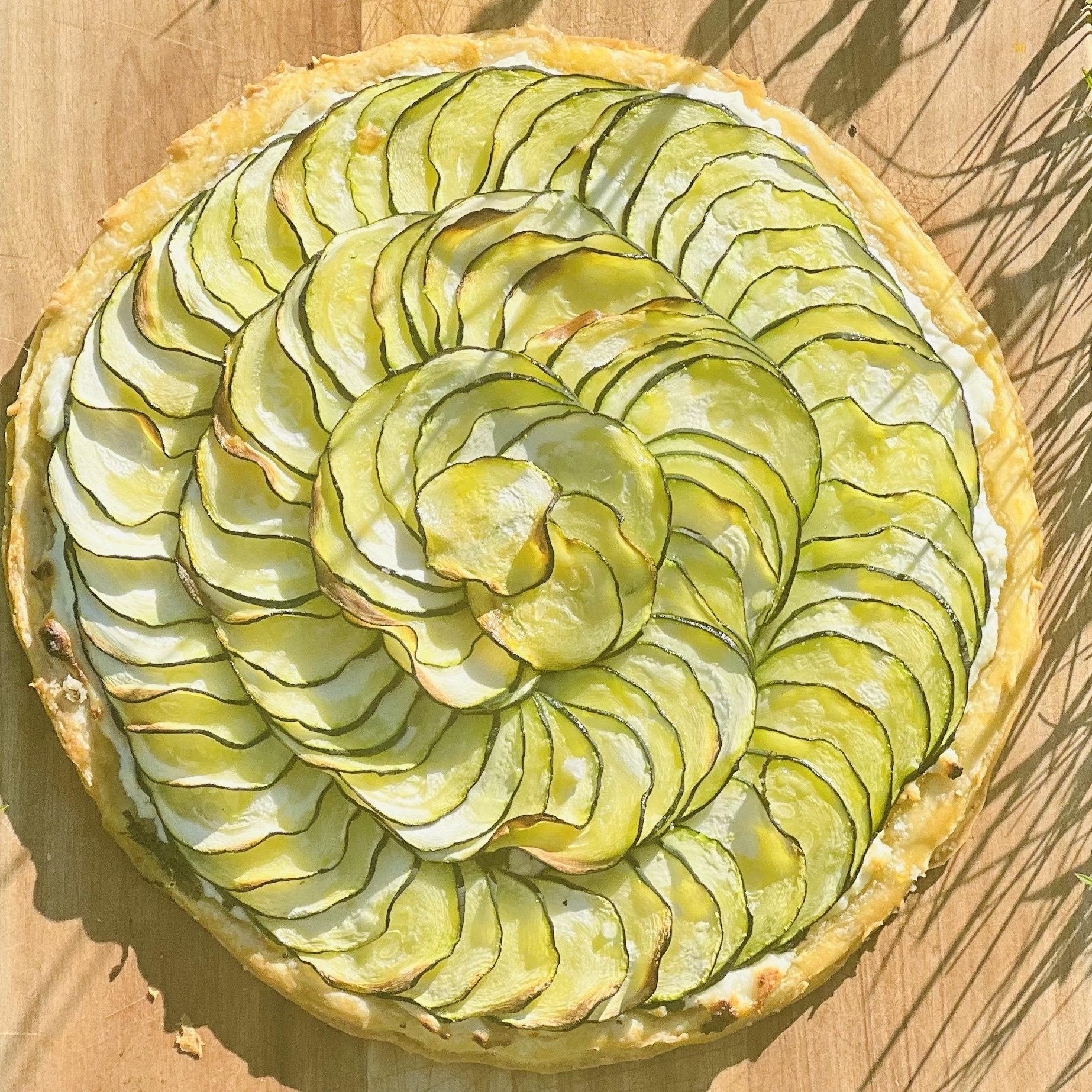 Cette tarte fine de courgettes coupées très finement (à la mandoline) repose sur une lit de brousse (fromage corse, qui peut être remplacé par de la ricotta). Elle fait son petit effet visuel … et gustatif.